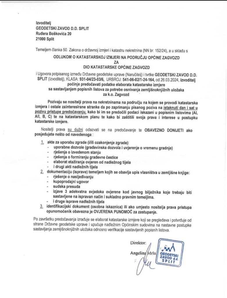 20/08/2025 Obavijest Geodetskog zavoda u svezi katastarske izmjere u k.o. Zagvozd Previous Obavijest o tribini za predočavanje Next Poziv na javni skup vezan uz katastarsku izmjeru